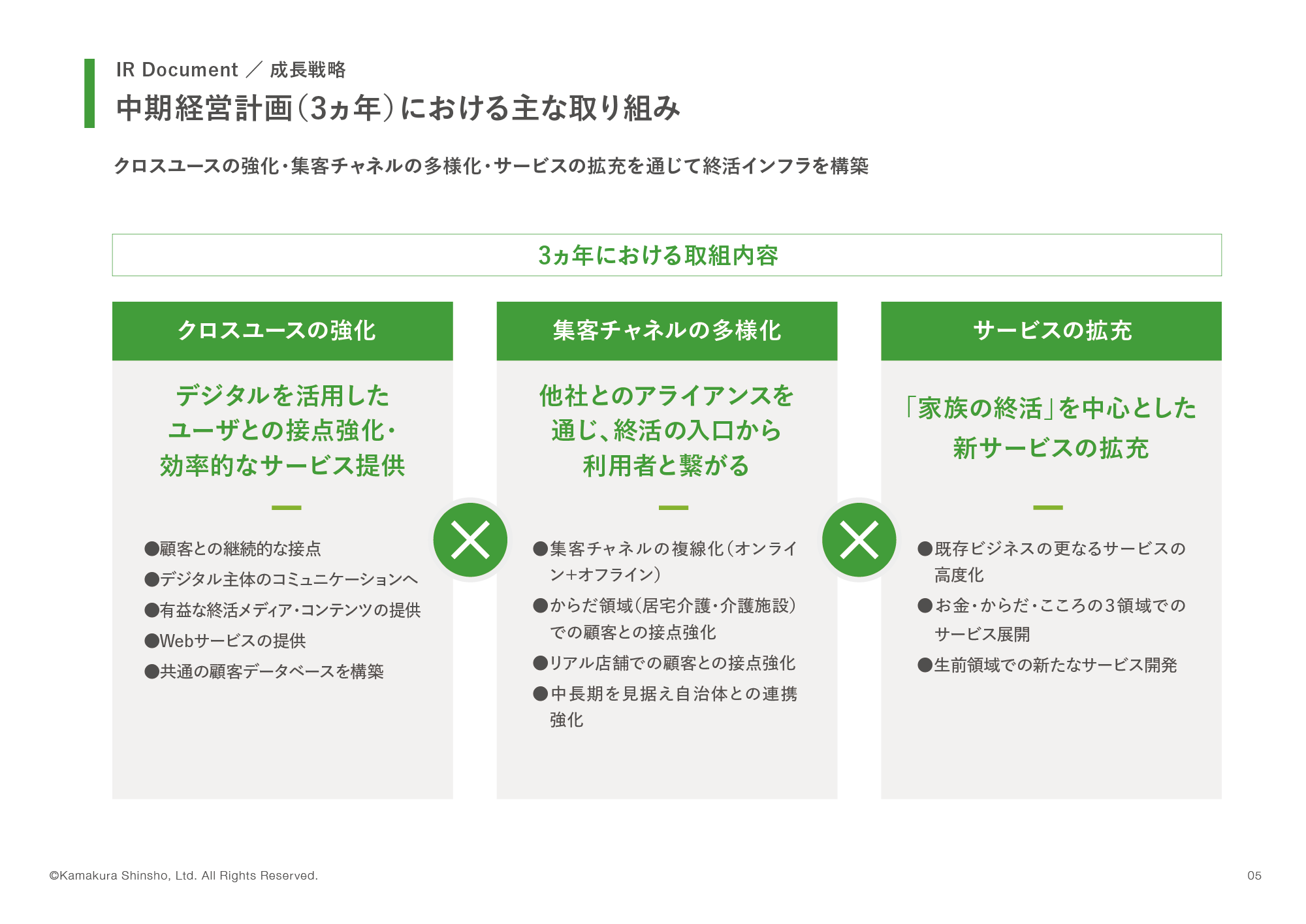 3つめは「サービスの拡充」です。特に、生前領域でサービスの拡充を進めていきます。例えば介護事業を通じてお客様の終活のニーズや課題を吸い上げて、お客様のライフタイムバリューを伸ばすような事業を展開していくこともできると思っています。