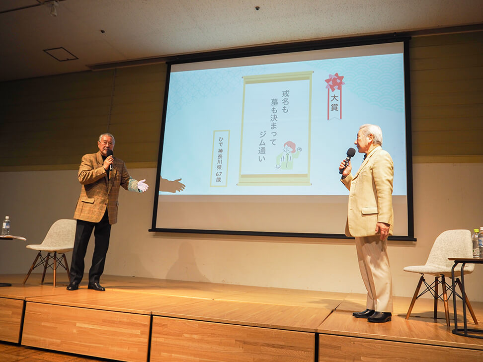 当日は、日本を代表するシンガー・ソング・ライター、作詞・作曲家として活躍する吉幾三さんと、元高知県知事で現在は一般財団法人教育支援グローバル基金代表理事として、未来ある若者達の支援活動に取り組む橋本大二郎さんを迎えてのトークショーや累計応募数が2,131件となった「終活川柳大賞」の授賞式を開催しました。