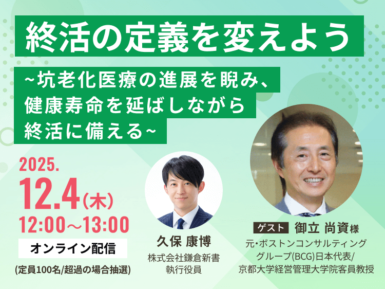 - 本セミナーでは、「よく生きるための終活」と「残された人のための終活」をつなぐために、本人・家族・企業・自治体が果たすべき役割を多角的に考察します。抗老化医療の視点を踏まえながら、これからの社会にふさわしい終活のかたちを探る機会として、皆さまの積極的なご参加をお待ちしております。